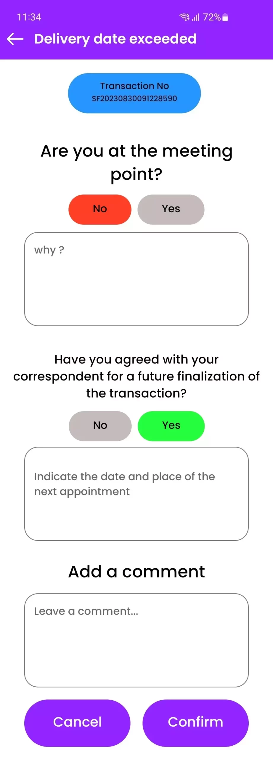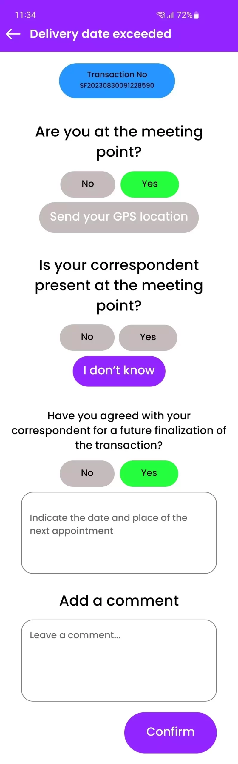 If the planned delivery date is exceeded without the correct code being entered by the recipient, a questionnaire will be sent to you. You will have to answer and validate this questionnaire, otherwise it will be considered as a breach of contract on your part. You can also send a claim via the « Complaint » button in the « My Account » section.