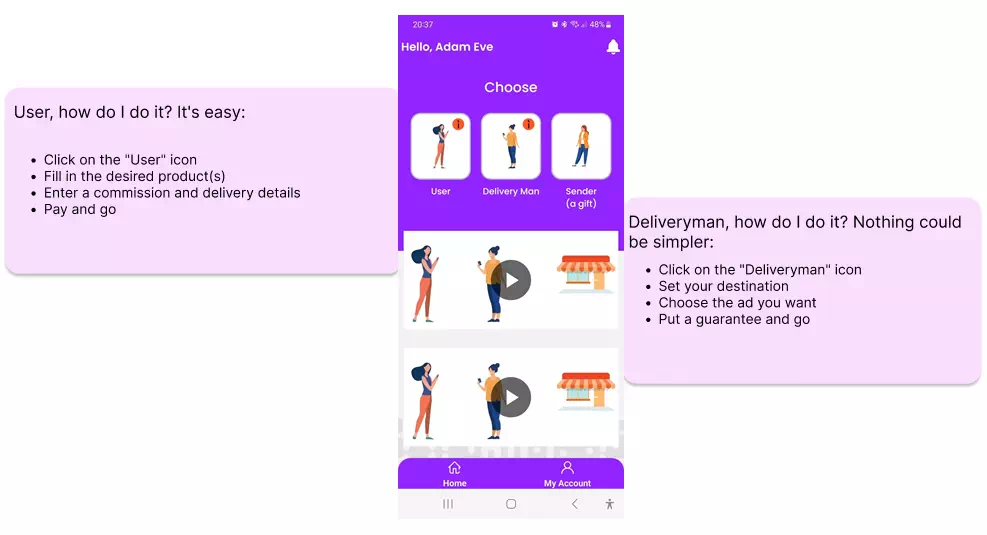 If you wish to purchase one or more products (limit of 5 different products with their quantities) and have them delivered to you, you must select «User» in the characters at the top of the main menu. You will be redirected to the product description page.
