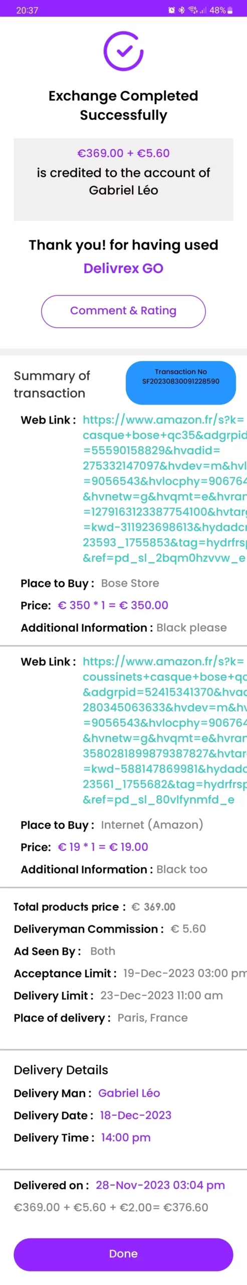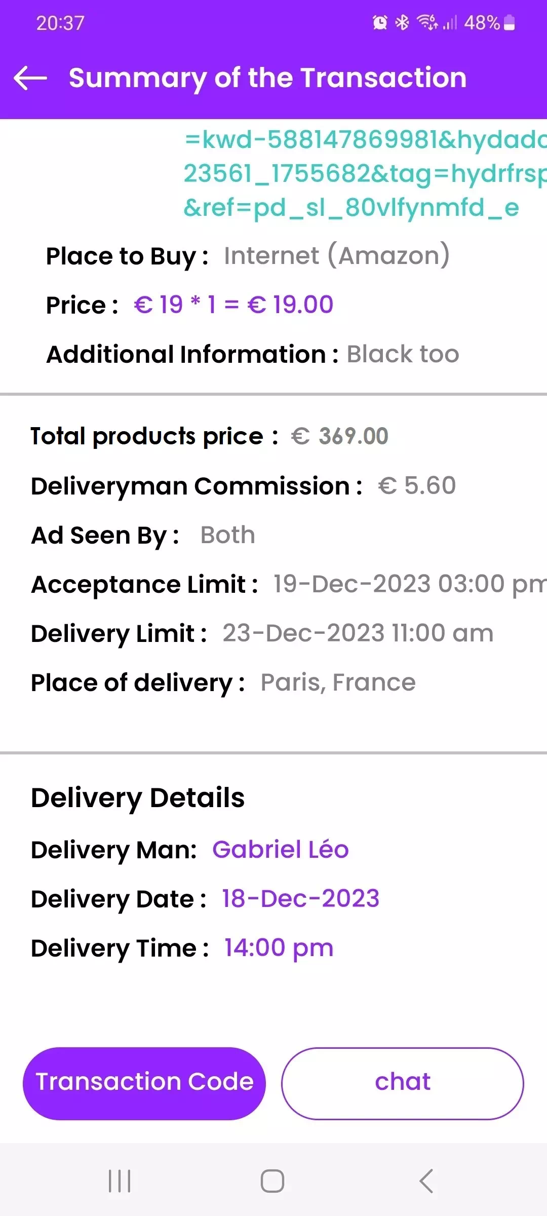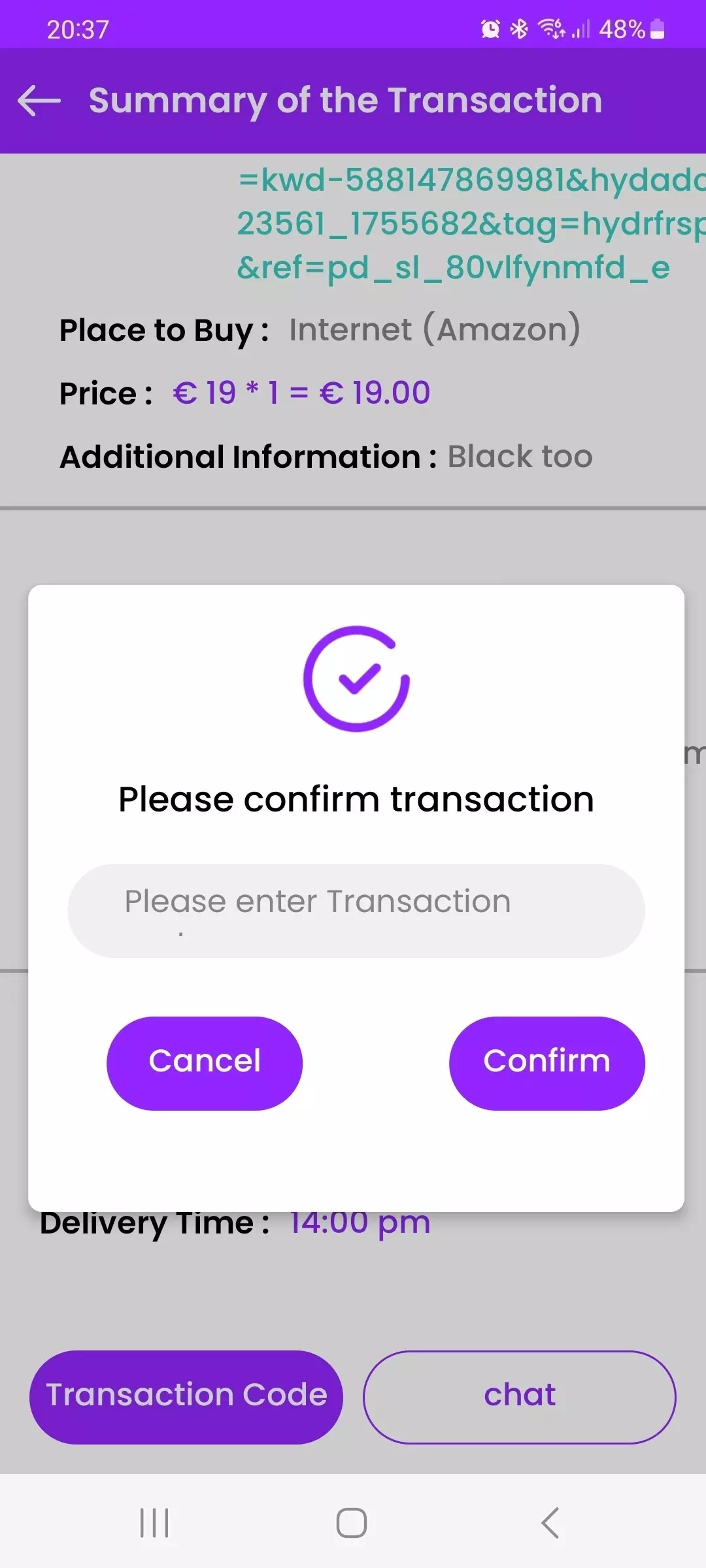 This code is visible on the deliveryman’s transaction summary page, and he will need to give it to you to enter it and finalize the transaction. Make sure you have a good internet connection to finalize the transaction.