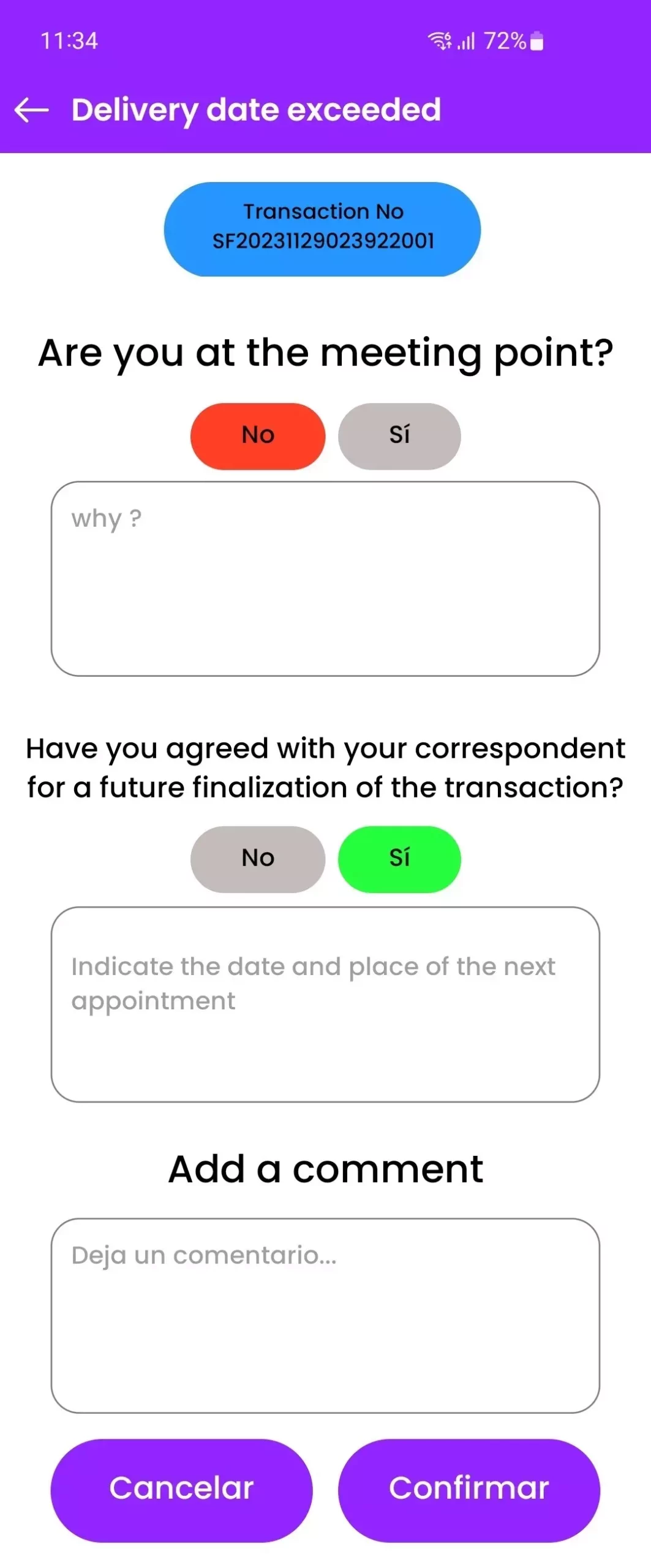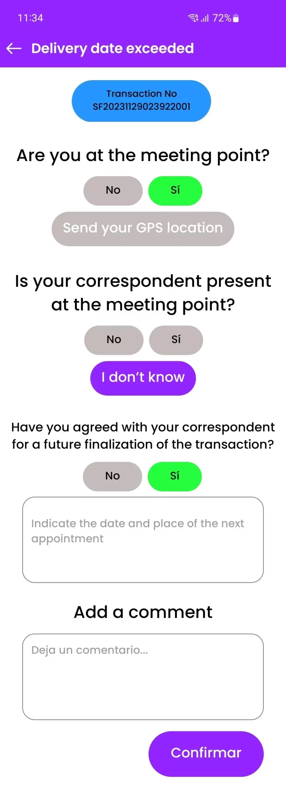 Si se sobrepasa la fecha de entrega prevista sin que el destinatario haya introducido el código correcto, se le enviará un cuestionario. Si no responde y valida este cuestionario, se considerará un incumplimiento de contrato por su parte. También puede enviar una queja a través del botón «Queja» de la sección «Mi cuenta».
